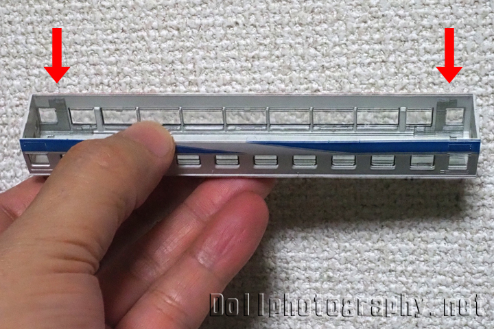 まず車体と動力ユニットは矢印の場所左右4か所で止まっていますので、車体の裾を広げる様にして動力ユニットの爪を外します。