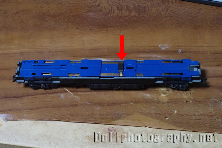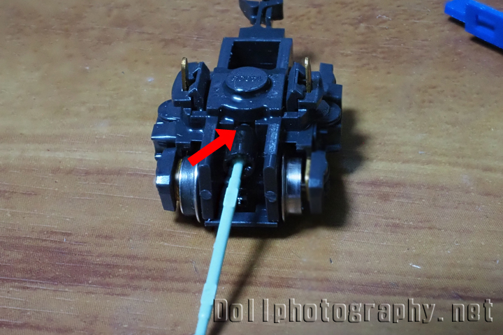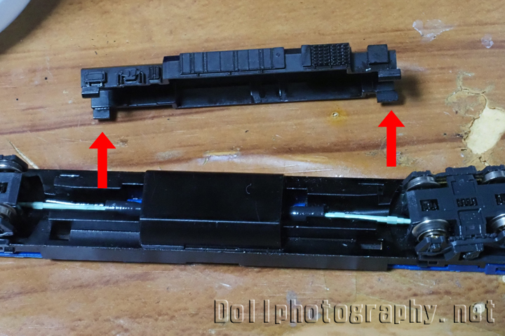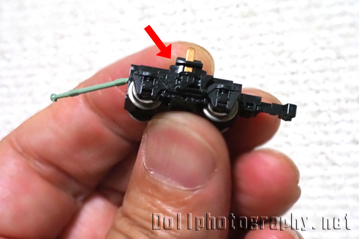 そこで今度は台車を外します。台車は動力ユニットに矢印部分の爪で引っかかっていますので、台車を捻る様にして外します。