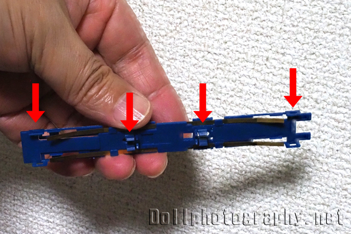 動力ユニットと室内を表現している青い板は赤矢印部分の左右8つの爪で止まっていますので、爪を折らないよう留意しながら外します。