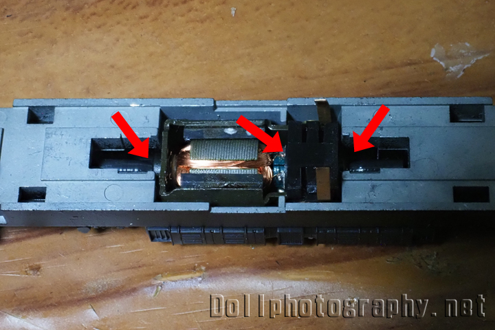 まずは金属音なのでモータ前後の軸受け、そしてブラシと回転部分の接点(中央矢印)を疑いそこに給油してみました。しかし改善が全く見られません。