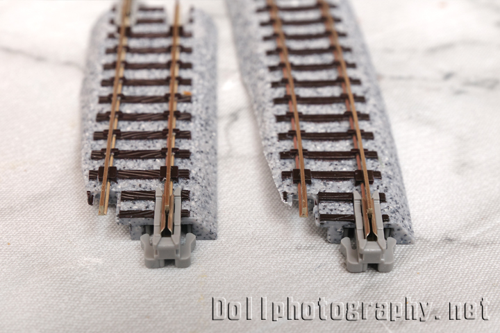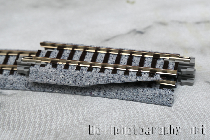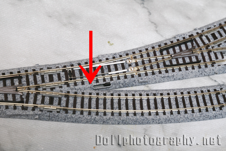 ところで冒頭の写真の様な連続する分岐を再現しようとすると矢印部分の道床が干渉してしまいます。そこで製品には60mmの裾をカットした直線が同梱されています。