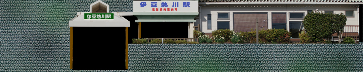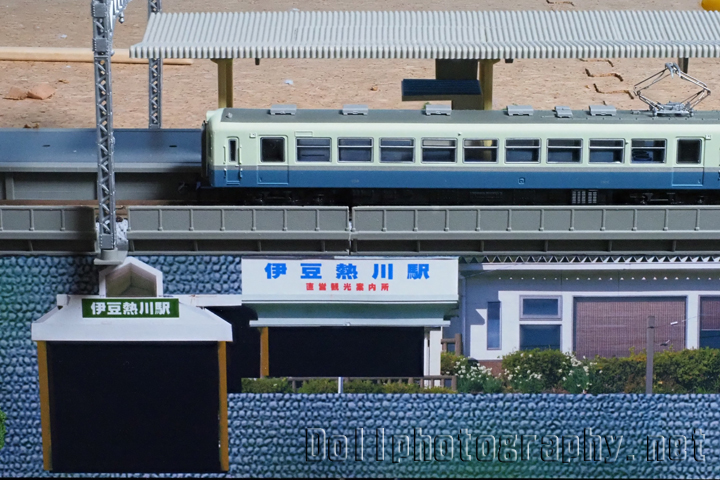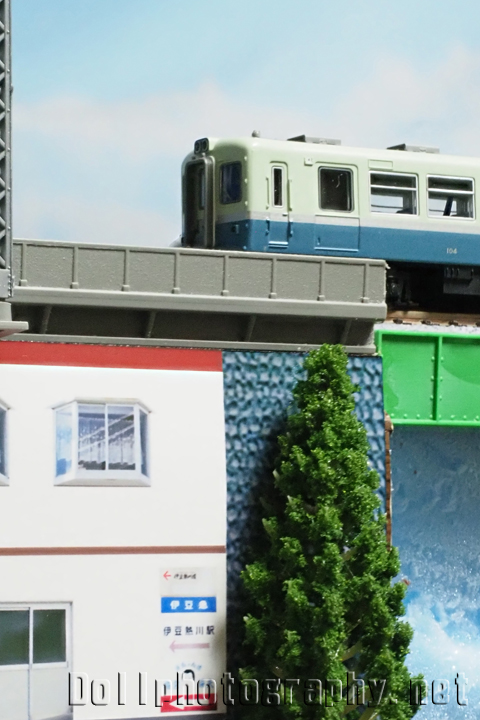 駅入口周辺はこんな感じでまとめました。デザインは最近ものもではなく平成初期頃のデザインで「伊豆熱川駅」の文字がテント上と駅を出てすぐの屋根上2か所にあります。そして赤文字で書かれた「直営観光案内所」の文字も再現しました。高さはボードに合わせて5.8cmとしました。
