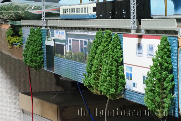 レイアウト配置はボードギリギリにレールを敷設していますので、駅舎を設けるスペースがありません。そこでこんな感じに厚紙に建物をプリント、貼り付けて表現しています。