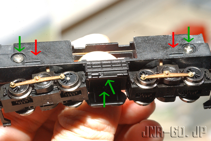 そして(写真はT車なのでモータがない)緑の矢印のネジ計4本を外すと台車が外れます。台車が外れたらアーノルドカプラーとスプリングを外しKATOカプラーを装着して、元のように組み付けました。