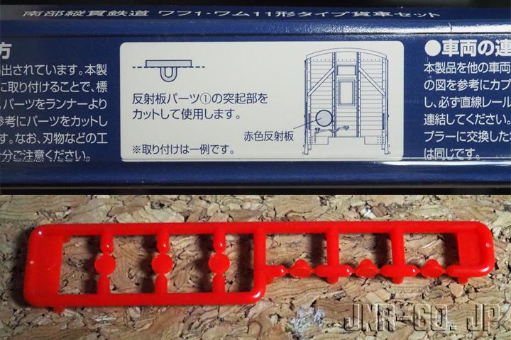 反射板は他の製品の流用で、このランナーが同梱されています。国鉄末期~JR初期に装着されていたコキの反射板でしょうか。後方のフックをカットして、両面で貼り付ける仕様です。