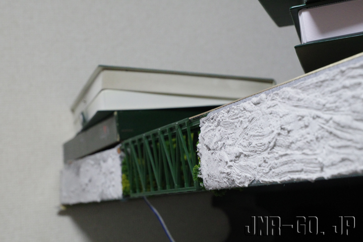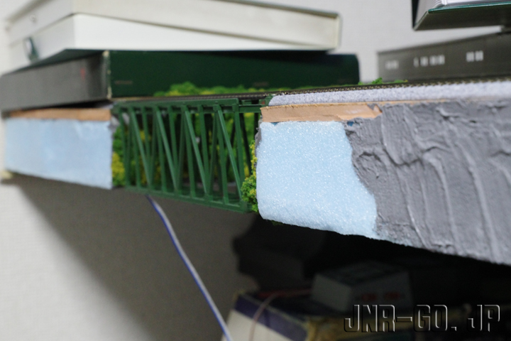 赤入洞橋梁っぽい橋梁をレイアウト一角の設けたことは先日記事にしましたが、レイアウトボードがスタイロフォームなので、幾ら周辺を作り込んでもボードの縁が見えるとそれだけでレイアウトの実物っぽさが0になってしまいます。